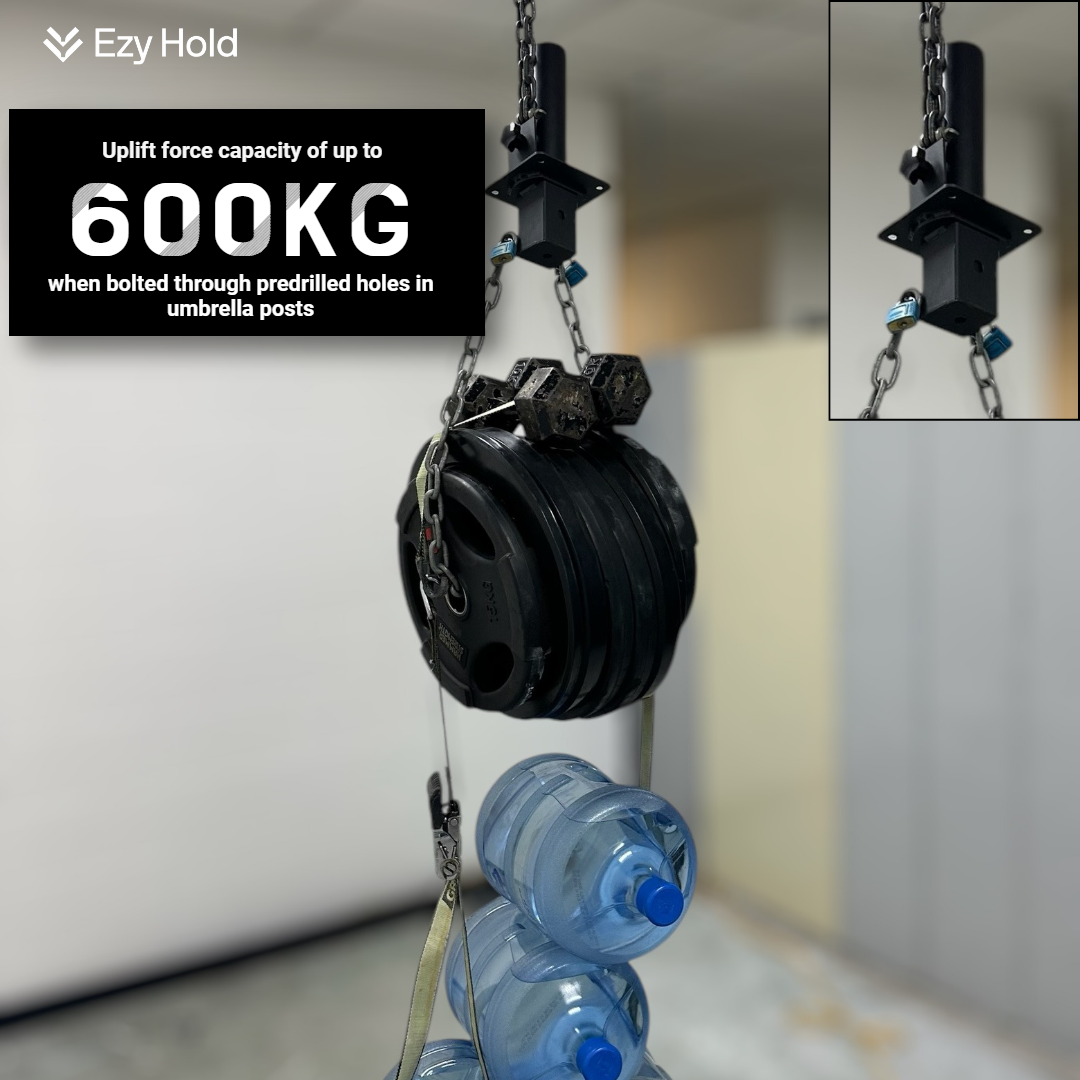 This Australian made patent applied for product has a uplift force capacity of up to 600kg when bolted through predrilled holes in umbrella posts. EzyHold is secure and is designed for longevity.